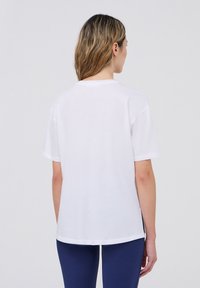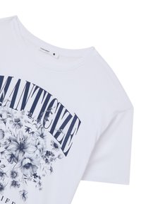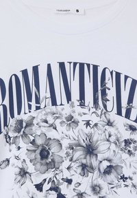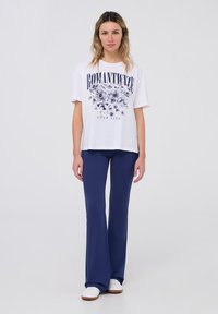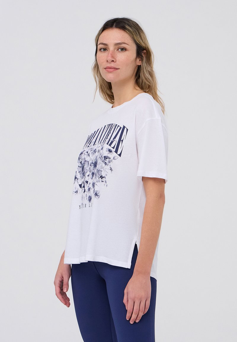 T-shirt bianco in cotone a maniche corte, con stampa grafica floreale in blu navy e testo. Vestibilità morbida con spacchi laterali; abbinato a leggings blu navy.