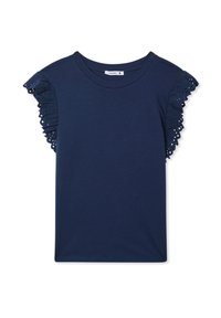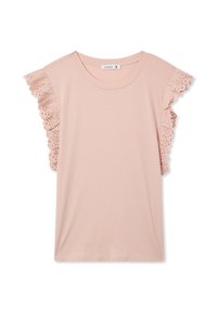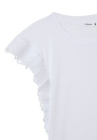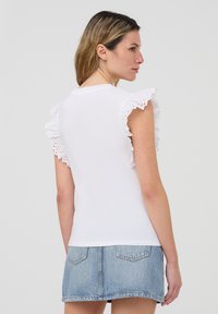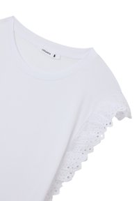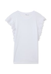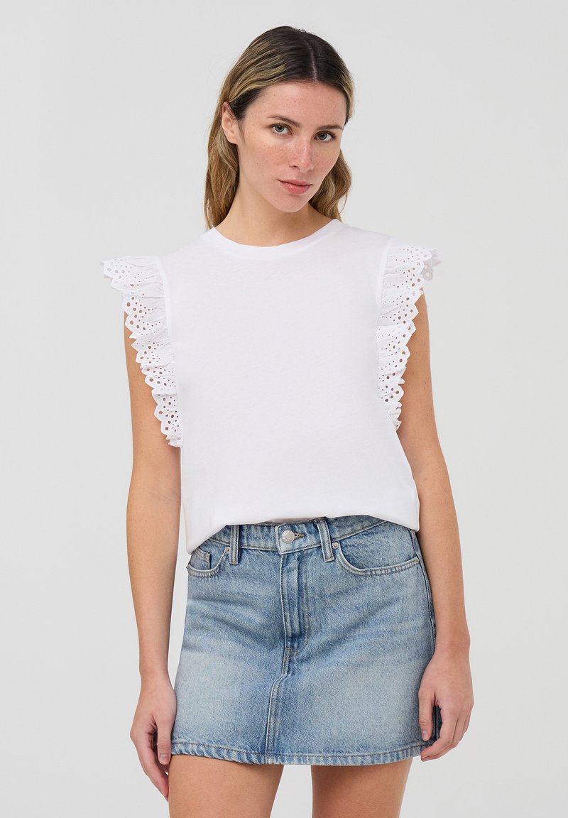 T-shirt bianco con maniche a volant bordate in pizzo, abbinato a una mini gonna in denim chiaro, con vita e una leggera sfumatura.