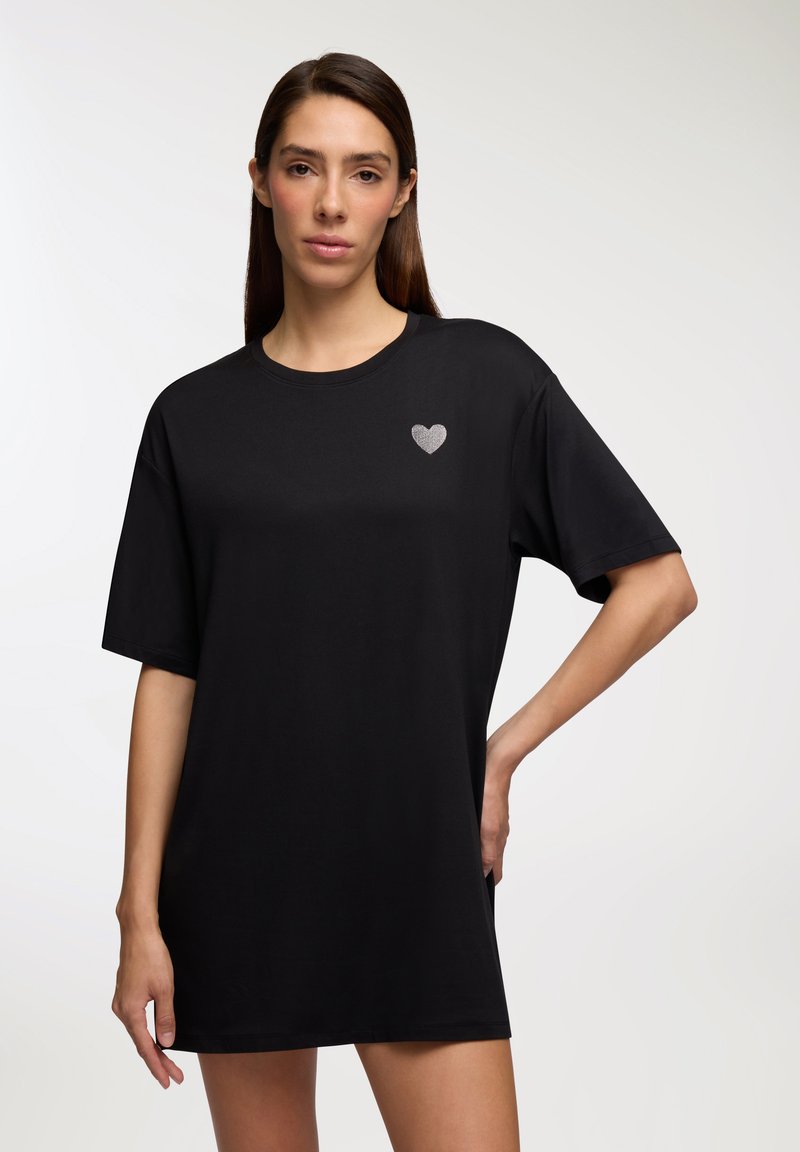 T-shirt nera oversize realizzata in tessuto morbido. Presenta una piccola grafica a forma di cuore argentato sulla parte sinistra del petto. Maniche corte e scollo rotondo.
