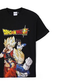 T-shirt nera a maniche corte con grafica di "Dragon Ball Super" che presenta personaggi colorati, abbinata a pantaloni cargo blu chiaro e sneakers.