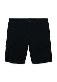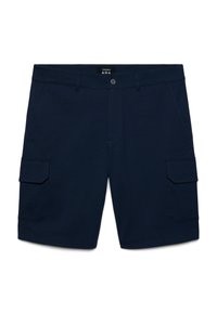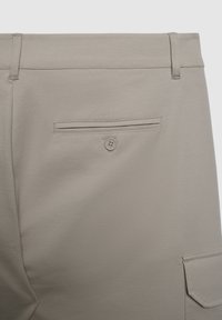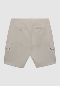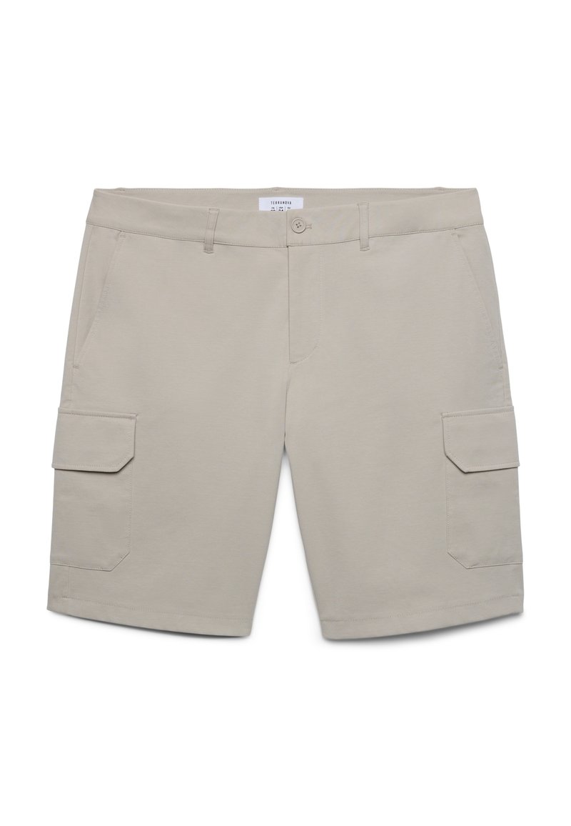 Shorts cargo beige con tasche laterali a patta, chiusura frontale con bottoni, passanti per cintura e tasche frontali a filetto, distesi su uno sfondo bianco.