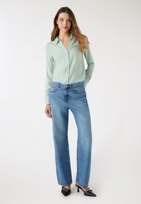 Camicia verde chiaro a maniche lunghe con colletto e bottoni, realizzata in un tessuto liscio; abbinata a jeans blu a vita alta.