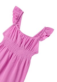 Abito senza maniche di colore rosa con spalline arricciate e corpetto plissettato, dotato di un orlo svasato. La texture sembra leggera e traspirante.
