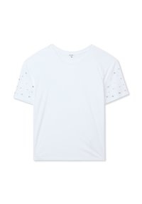 T-shirt bianca realizzata in tessuto morbido, con maniche corte decorate con borchie trasparenti. Design semplice con scollo rotondo.