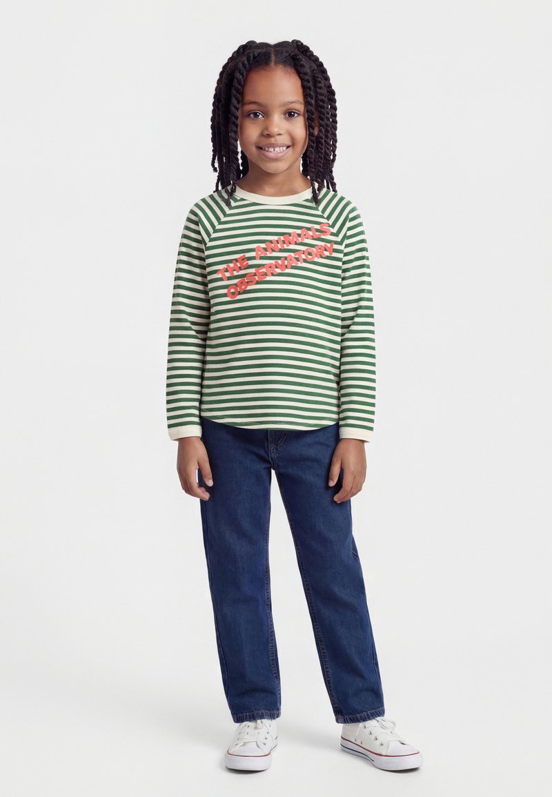 Maglia a righe orizzontali verdi e bianche con collo e polsini color crema, con scritta rossa "THE ANIMALS OBSERVATORY" sul petto.