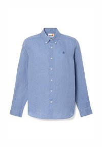 Camicia a maniche lunghe blu chiaro in un misto lino, con colletto, bottoni frontali e un piccolo logo sul petto.