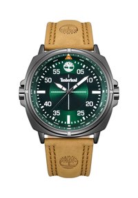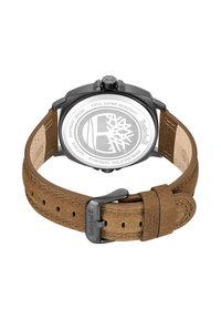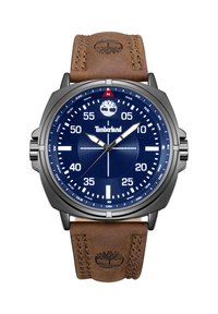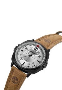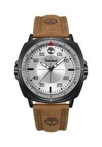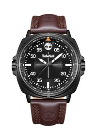 Orologio da polso Timberland con quadrante argento, cassa nera, cinturino in pelle marrone, lancette grandi bianche per ore e minuti e indicatori della bussola intorno alla lunetta.