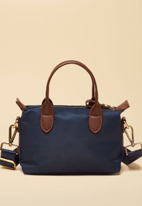 Piccola borsa rettangolare con manici in pelle marrone e tessuto a quadri in blu, marrone e bianco, con tracolla marrone staccabile.