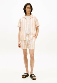 Uomo che indossa pantaloncini a righe bianche e arancioni e sandali neri aperti sulle dita, in piedi con le mani in tasca su uno sfondo bianco.