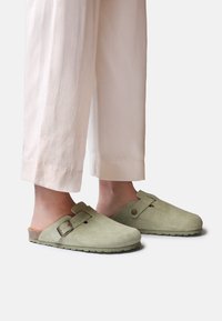 Persona che indossa pantaloni beige chiaro cropped e zoccoli slip-on in camoscio verde con fibbie regolabili su sfondo uniforme.