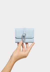 Mano che tiene un piccolo portafoglio in pelle azzurro chiaro con una chiusura ovale d'argento su uno sfondo semplice.