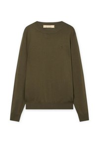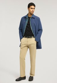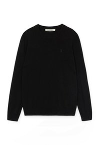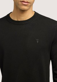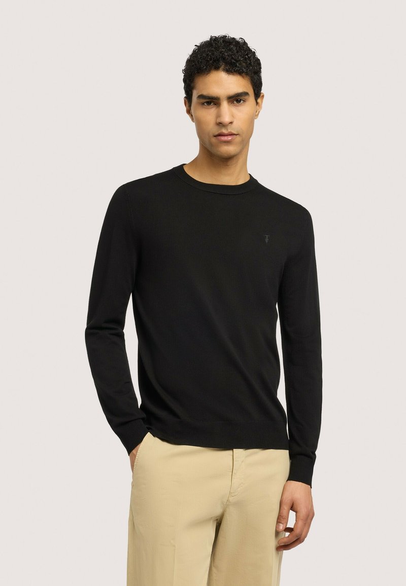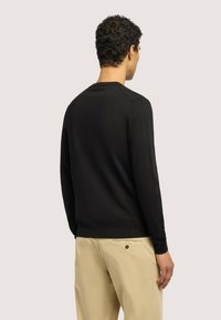 Giovane uomo con capelli corti e ricci, che indossa un maglione nero a maniche lunghe e pantaloni beige, in piedi con una mano in tasca.