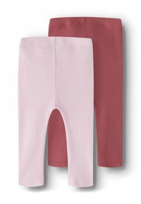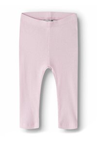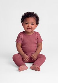 Bambino sorridente con capelli ricci, indossa una maglietta rosa a maniche corte a coste e pantaloni abbinati, seduto a piedi nudi su una superficie grigio chiaro.
