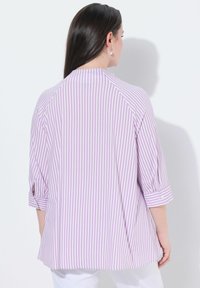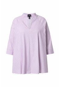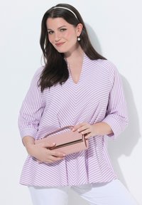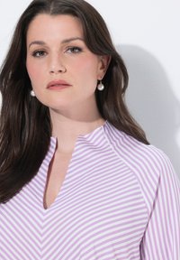 Donna con capelli lunghi e scuri che indossa orecchini di perle e una maglia a righe lavanda e bianca con maniche a tre quarti, in piedi contro un muro bianco.