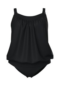 Donna con capelli ricci che indossa un costume da bagno due pezzi blu navy, in piedi davanti a uno sfondo chiaro e uniforme.