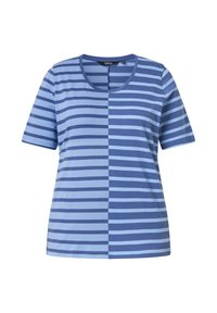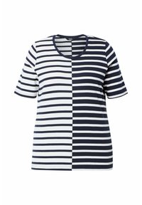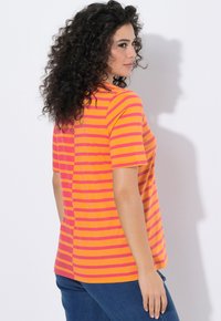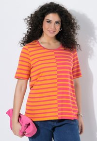 Donna con capelli ricci e scuri che indossa una maglietta a righe orizzontali arancioni e rosa a maniche corte e jeans blu, in piedi davanti a uno sfondo bianco.