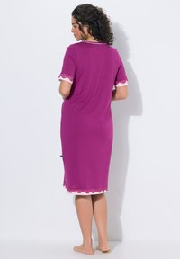 Donna sorridente, in piedi a piedi nudi, che indossa un vestito viola al ginocchio con rifiniture in pizzo rosa sulle maniche e sull'orlo, su uno sfondo bianco uniforme.