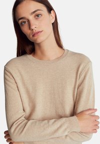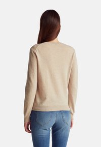 Maglione di lana beige con scollatura a girocollo e polsini a costine, abbinato a jeans azzurri aderenti. Il tessuto appare morbido e con una texture.