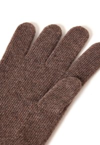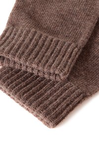 Guanti in maglia marrone con polsini a coste, realizzati in un morbido mix di lana. Presentano cinque aperture per le dita e una superficie texturizzata.