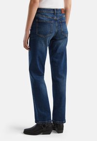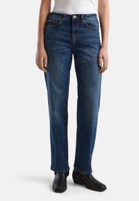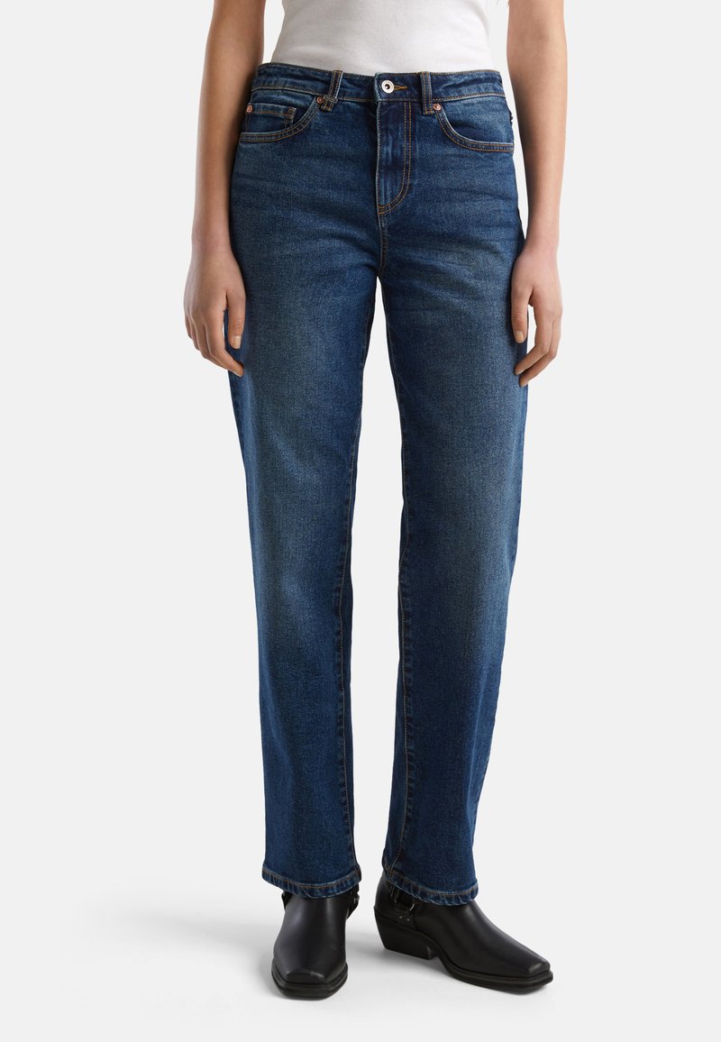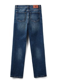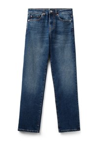 Jeans in denim blu con gamba dritta, cinque tasche, rivetti in rame e chiusura a pulsante. La texture del tessuto è liscia con una leggera scoloritura sulle gambe.
