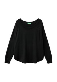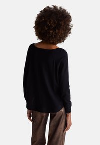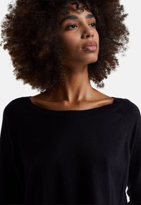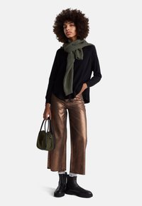 Maglione nero a maniche lunghe con scollo a spalle scoperte, realizzato in materiale morbido, abbinato a pantaloni ampi in bronzo metallizzato.