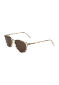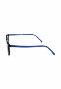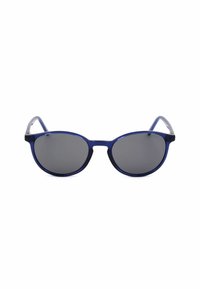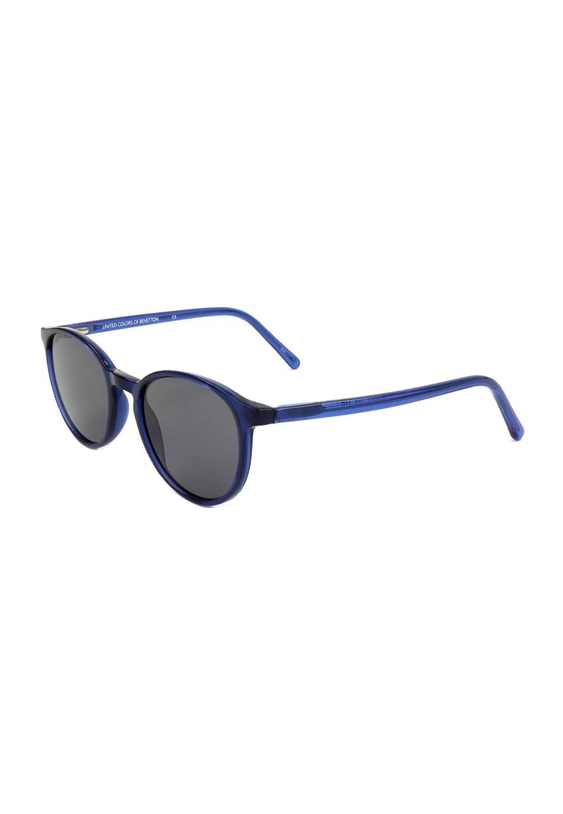 Occhiali da sole rotondi con montatura blu, lenti scure, aste in plastica leggera e marchio "United Colors of Benetton" all'interno.