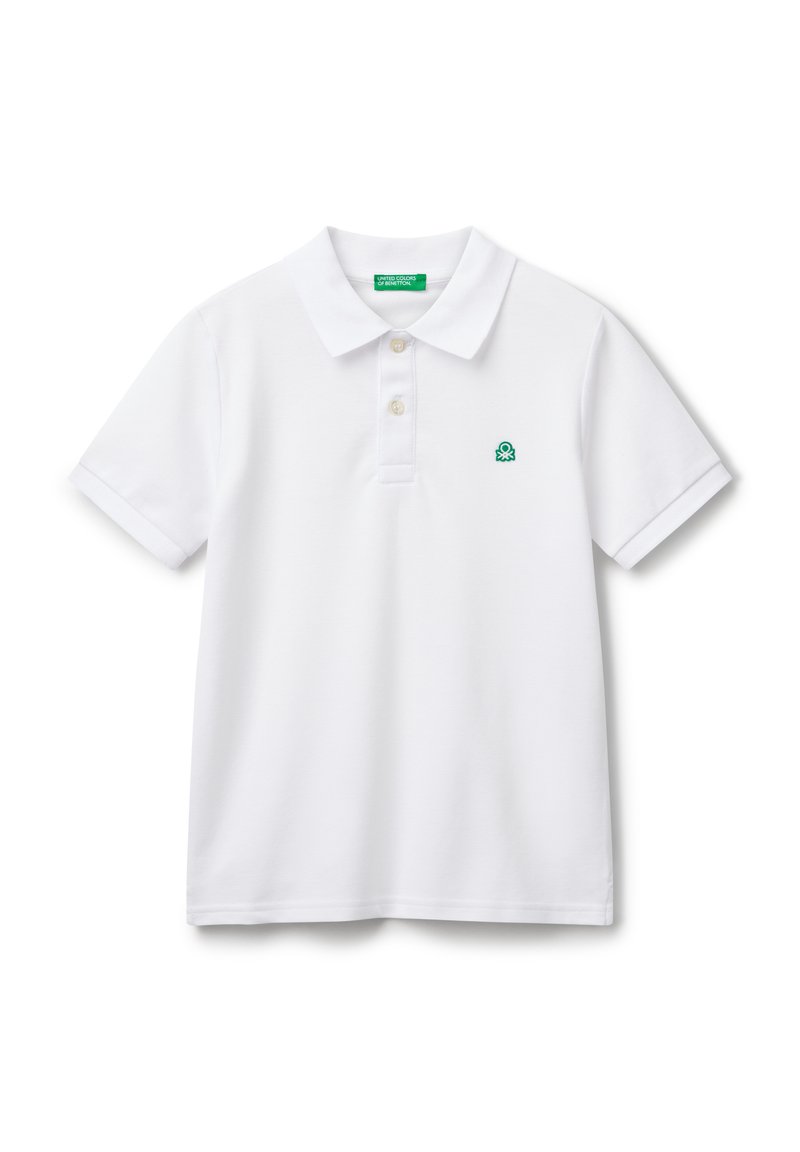Polo shirt bianco a maniche corte con colletto, due bottoni e piccolo logo ricamato verde sul lato sinistro del petto.