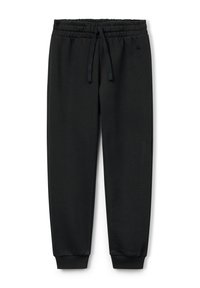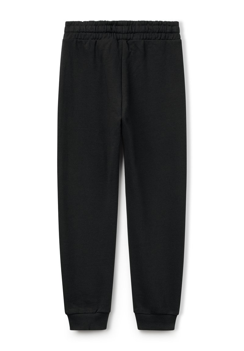 Pantaloni sportivi neri con vita elasticizzata, gambe affusolate e polsini a costine, realizzati in un tessuto morbido ed elastico. Nessun motivo o dettaglio visibile.