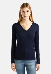 Donna con i capelli scuri raccolti indossante una maglietta bianca a maniche lunghe con scollo a V e pantaloni di velluto a coste grigi chiari, su uno sfondo semplice.