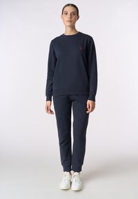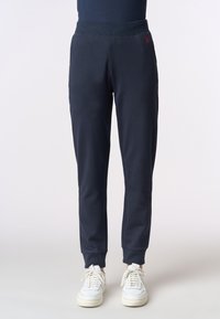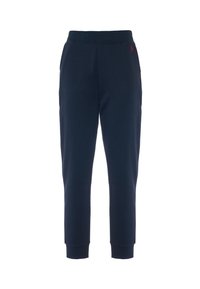 Pantaloni jogger blu navy realizzati in morbido tessuto, con vita elasticizzata, polsini a coste e un piccolo dettaglio del logo rosso.