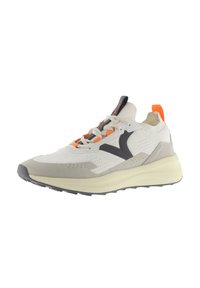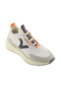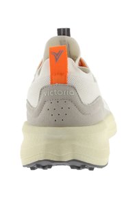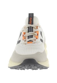 Scarpa da corsa leggera in bianco e beige, con un logo nero, dettagli arancioni, tessuto traforato e suola imbottita e testurizzata.