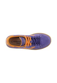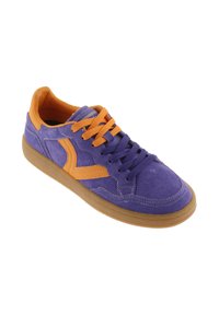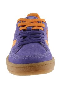Scarpa da ginnastica in camoscio viola con dettagli arancioni, lacci e logo, con suola in gomma colorata, mostrata dal lato esterno su sfondo bianco.