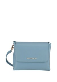 Borsa a tracolla in pelle grigio chiaro con chiusura a pattina, dettagli della tracolla in tono oro "VALENTINO" e tracolla regolabile. Superficie testurizzata.