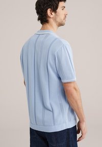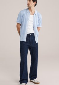 Uomo con camicia azzurra a maniche corte su canottiera bianca e jeans blu scuro, in piedi con le mani nelle tasche, sfondo neutro.