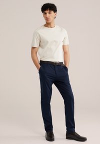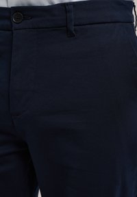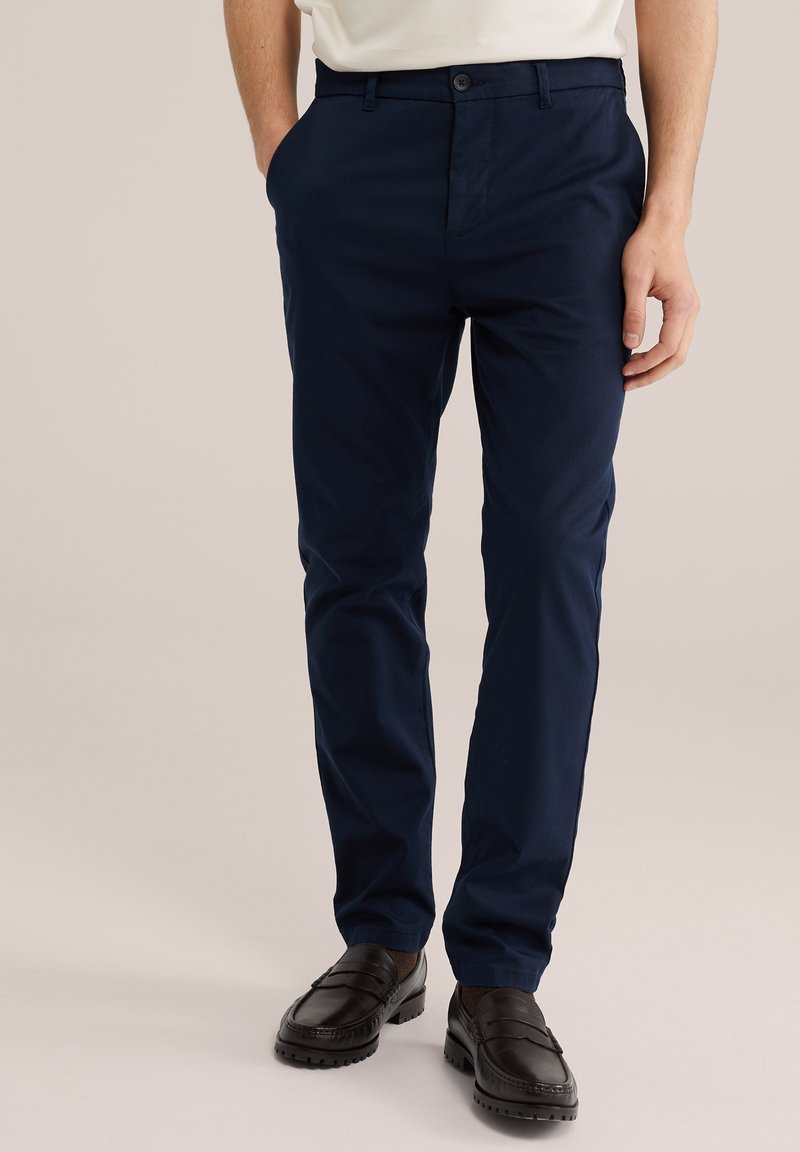 Uomo che indossa pantaloni chinos slim fit blu navy con tasche laterali e mocassini in pelle nera, in piedi davanti a uno sfondo neutro.