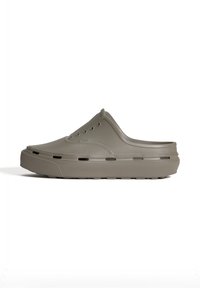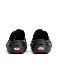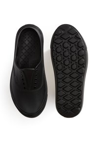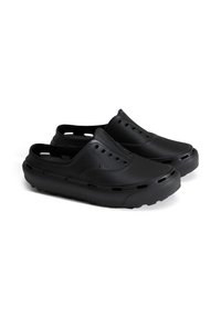 Zoccoli in gomma neri con design arrotondato, tallone aperto, fori di ventilazione e suola scanalata per trazione. Presentano un materiale liscio con linee curve.