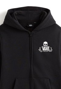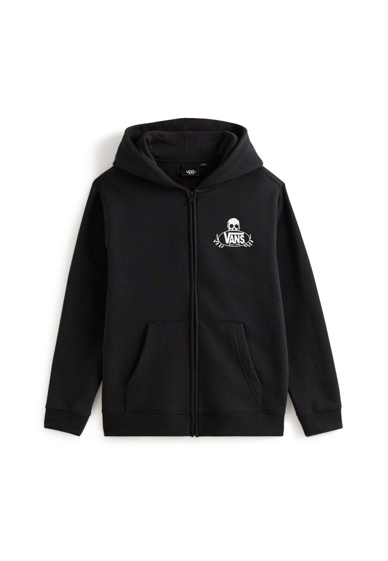 Felpa nera con zip realizzata in morbido misto cotone. Presenta un logo frontale con un teschio, tasche a marsupio e un cappuccio ampio.