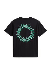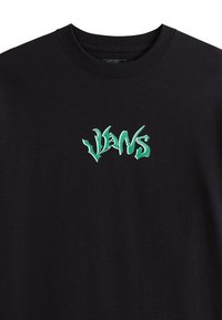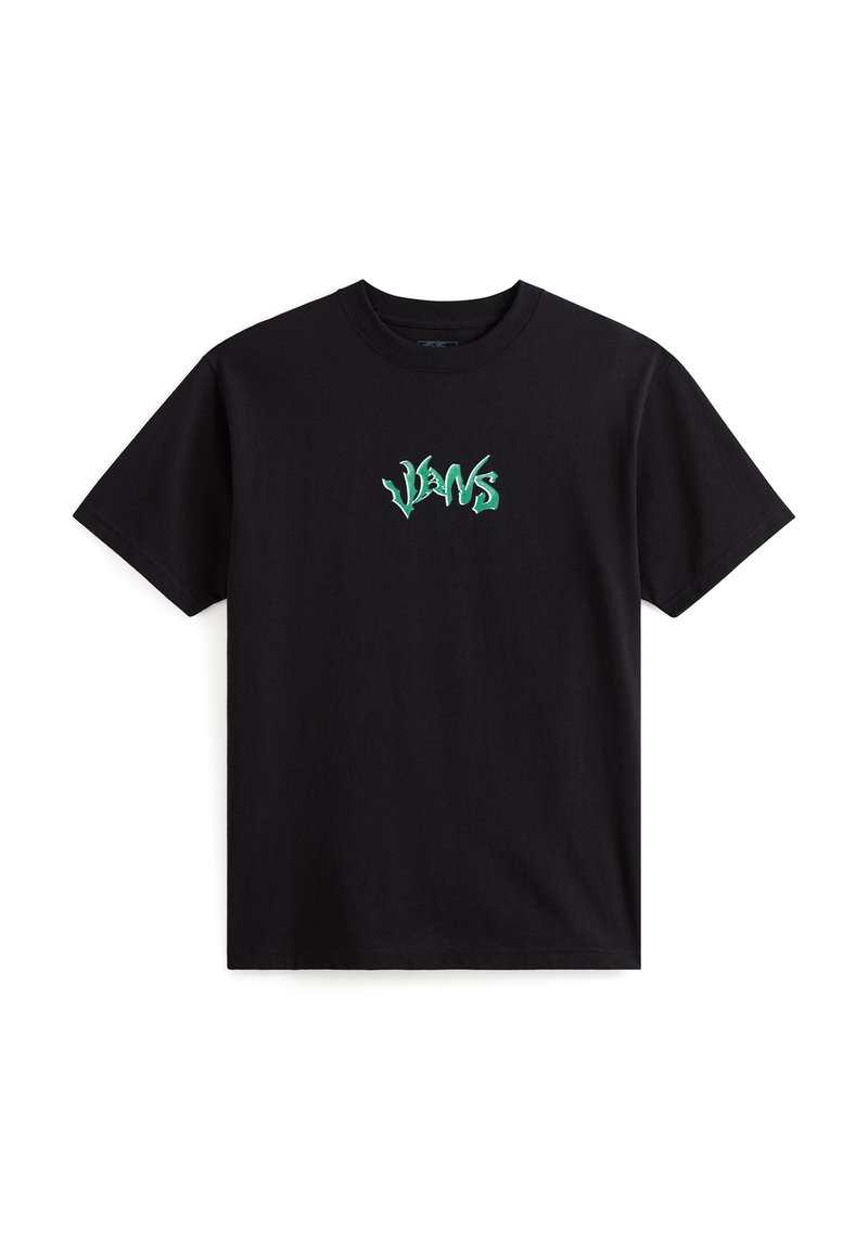 Maglietta nera in cotone con testo grafico verde "VANS" in un carattere stilizzato sulla parte anteriore, con maniche corte e scollo rotondo.