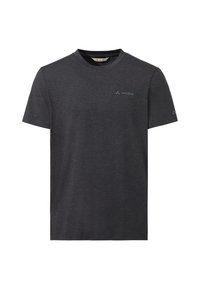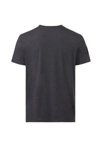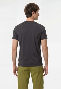 Giovane uomo che indossa una maglietta a maniche corte grigio scuro e pantaloni verde oliva, in piedi davanti a uno sfondo chiaro uniforme.