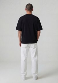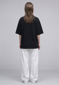 Uomo che indossa una t-shirt nera oversize con il logo colorato "VERTERER" e testo bianco sul retro, abbinata a pantaloni bianchi, visto di spalle.