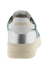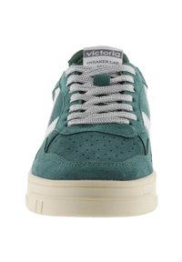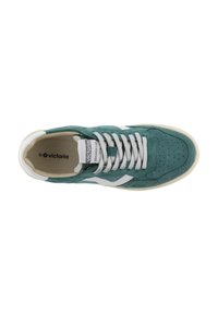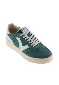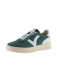 Sneaker in suede verde con accenti bianchi, dettaglio in argento sul tallone e lacci grigi. Presenta una punta perforata e una soletta in gomma.