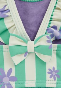 Costume da bagno a due pezzi a righe verdi e bianche con stampe di margherite viola, spalline arricciate sulla parte superiore e rifiniture arricciate sui pantaloni.