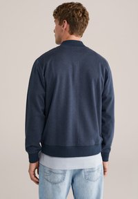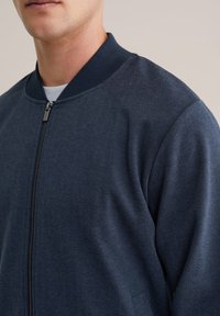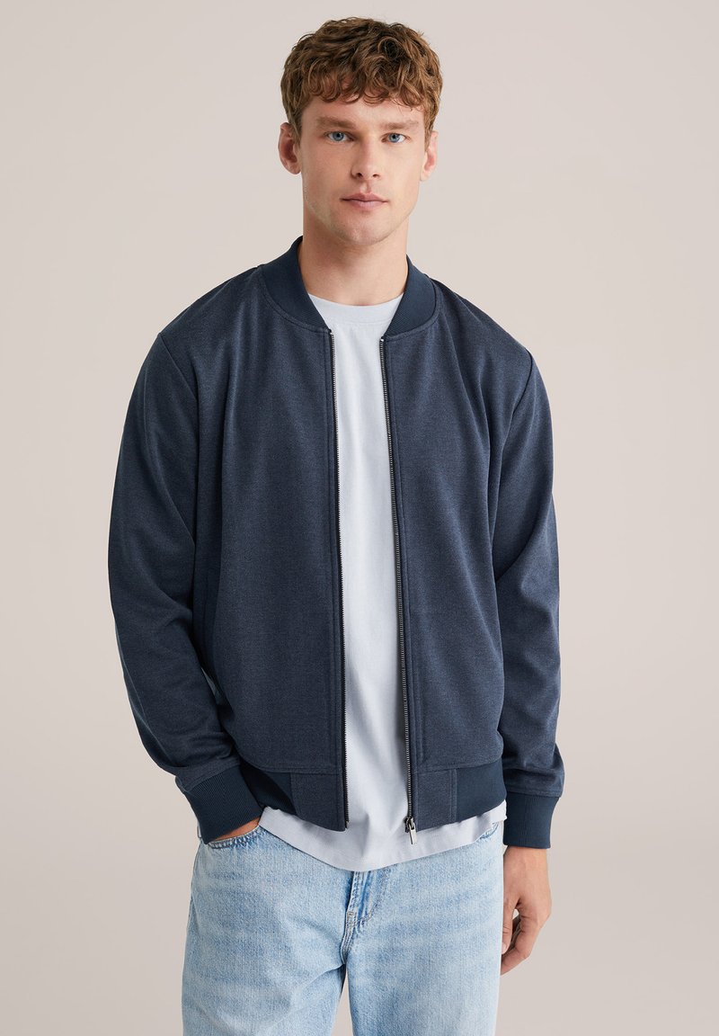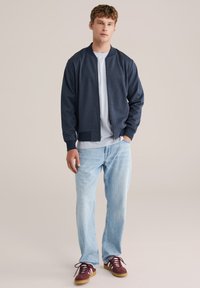 Giacca bomber blu navy con zip frontale, polsini e orlo a coste. Indossata sopra una t-shirt grigio chiaro, abbinata a jeans di denim azzurro.