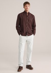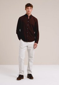 Uomo che indossa pantaloni bianchi aderenti, camicia marrone scuro con bottoni e scarpe di pelle marrone scuro, in piedi contro uno sfondo neutro.