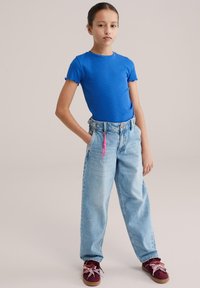 Top blu a maniche corte con coste, jeans a vita alta in denim chiaro, dettaglio con coulisse rosa e sneakers bordeaux con lacci decorati.