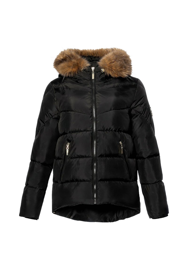 Giacca imbottita nera con chiusura frontale a cerniera, due tasche con zip e cappuccio con bordo in pelliccia marrone, leggermente più lunga nella parte posteriore.