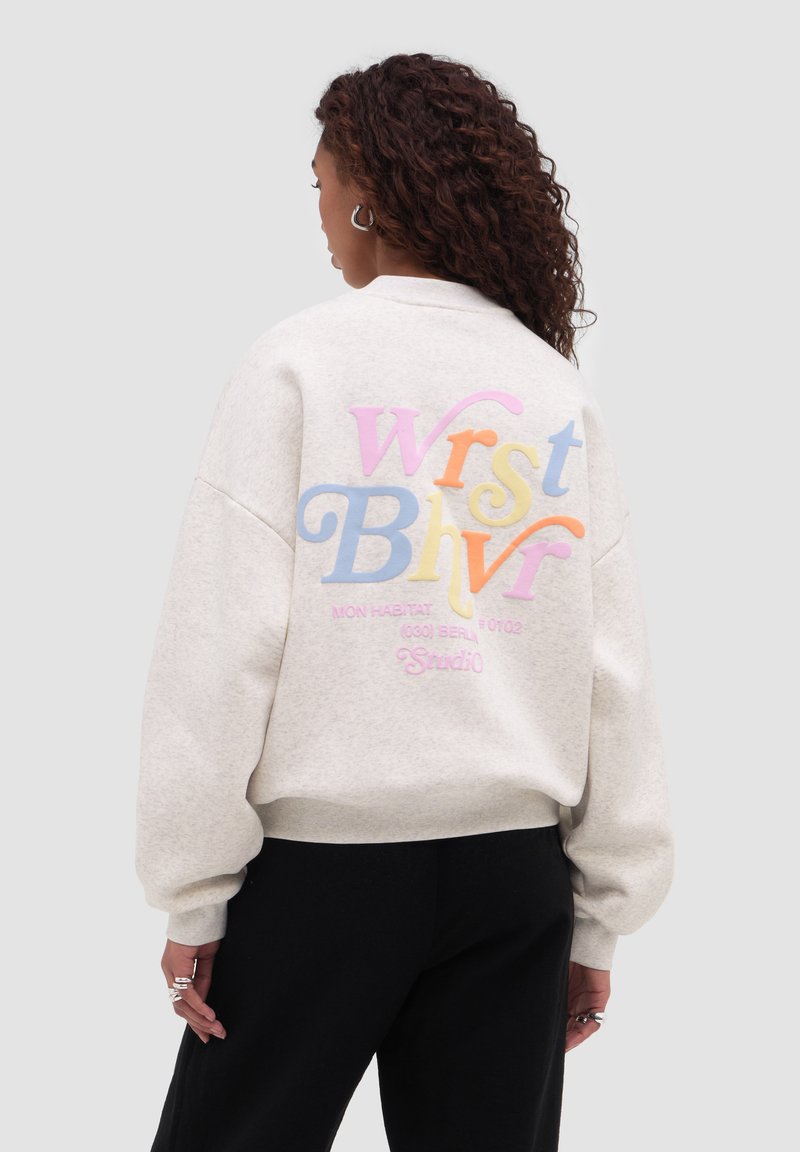 Donna con capelli ricci che indossa una felpa beige chiaro con un grande testo colorato "Wrist Bhvr" sul retro, abbinata a pantaloni neri.