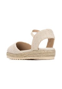 Sandalo espadrille beige con tomaia intrecciata, cinturino alla caviglia e fibbia dorata. Suola intermedia in juta e suola esterna in gomma testurizzata con motivo a zigzag.