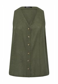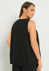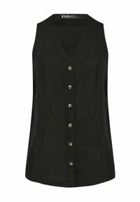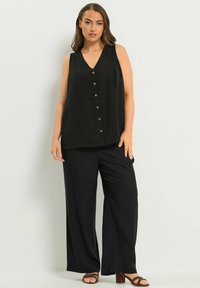 Donna con lunghi capelli castani che indossa una canotta nera abbottonata e pantaloni neri, in posa con una mano nella tasca.